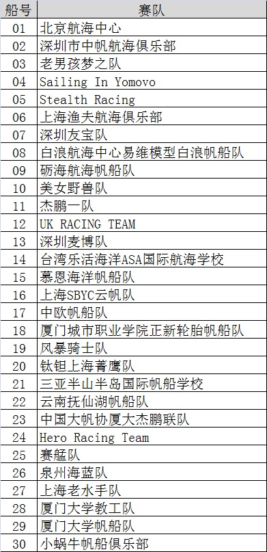 >第11届中国“俱乐部杯”帆船挑战赛船号抽签结果
