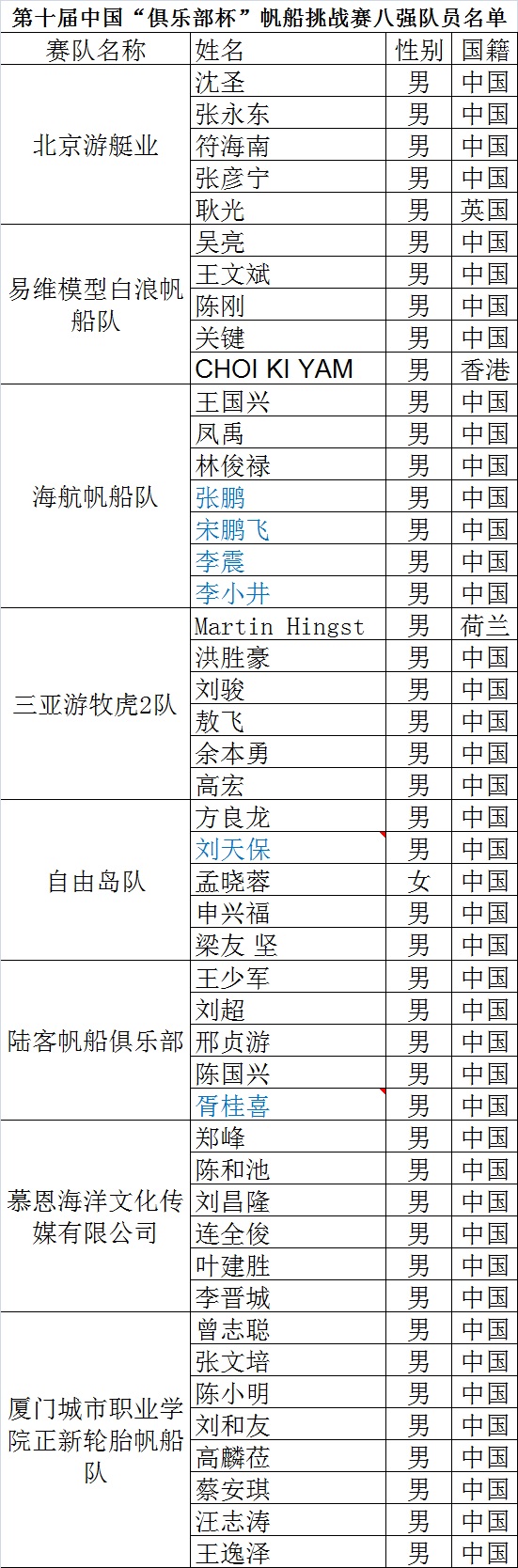 第十届中国“俱乐部杯”帆船挑战赛八强队员名单