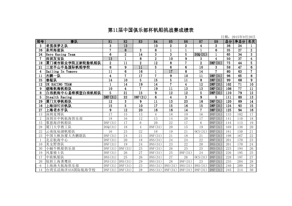 >第11届中国“俱乐部杯”帆船挑战赛成绩发布