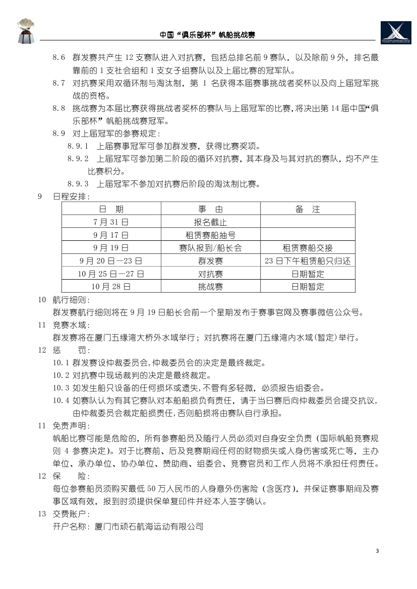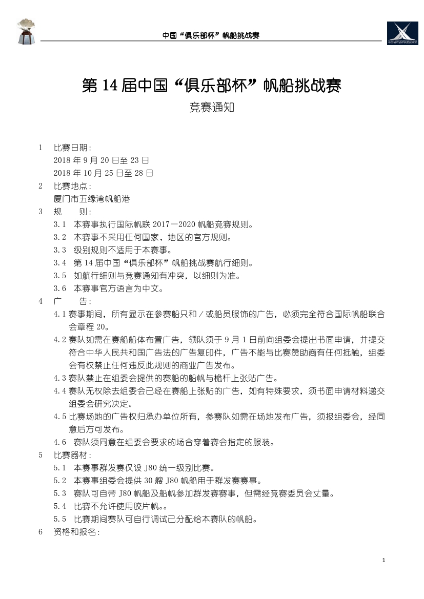 第14届中国“俱乐部杯”帆船挑战赛 竞赛通知